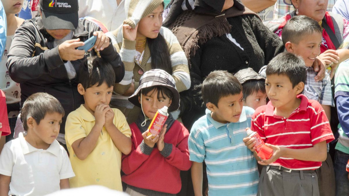 Niños pequeños con latas de espuma de fiesta, Carnaval en Guaranda, Ecuador