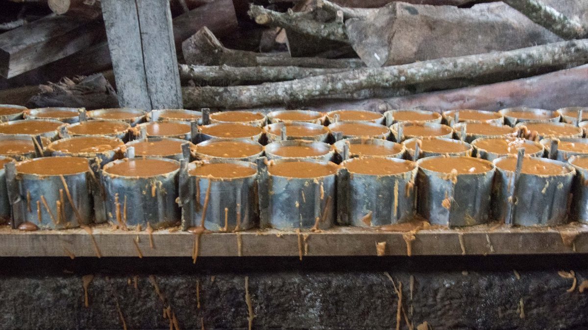 The chaff, barago, is left to dry. It will be used to feed animals on the farm. The remaining cane juice is cooked in a series of vats until it becomes syrup, or jarabe. At the final vat, the person holding a large wooden paddle, un batidor, decides when the syrup has reached the correct point that it will harden into a solid mass when cooled. They use the paddle to stir and stir the thickening mixture. Then they lift portions and place them into molds. At Finca Santa Teresita, they use a round mold for their blocks of panela. When the sugar hardens, the mold is removed and the panela is ready for sale.