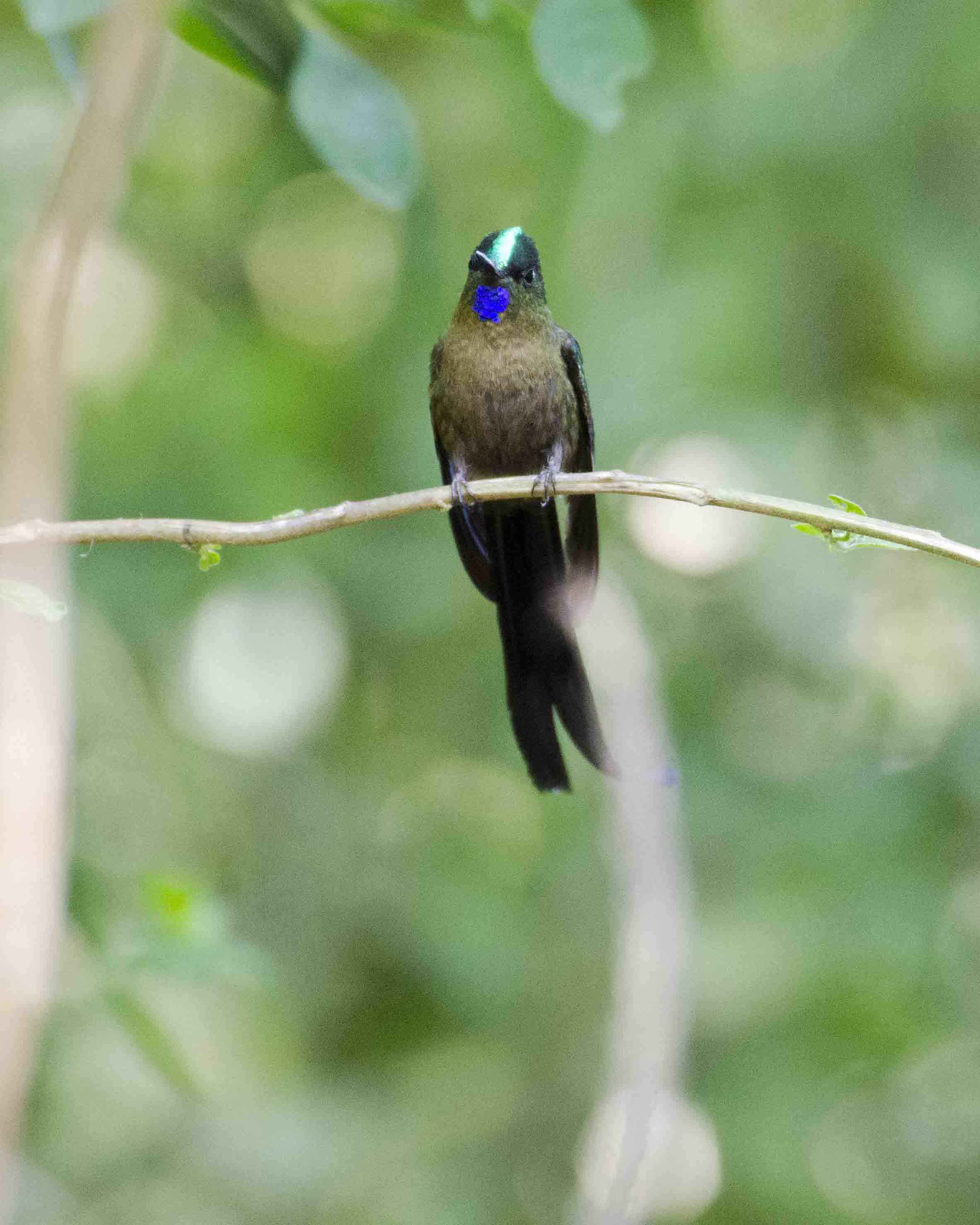 Violet-tailed Sylph with very apparent neon green stripe on forehead and patch of violet at his throat.