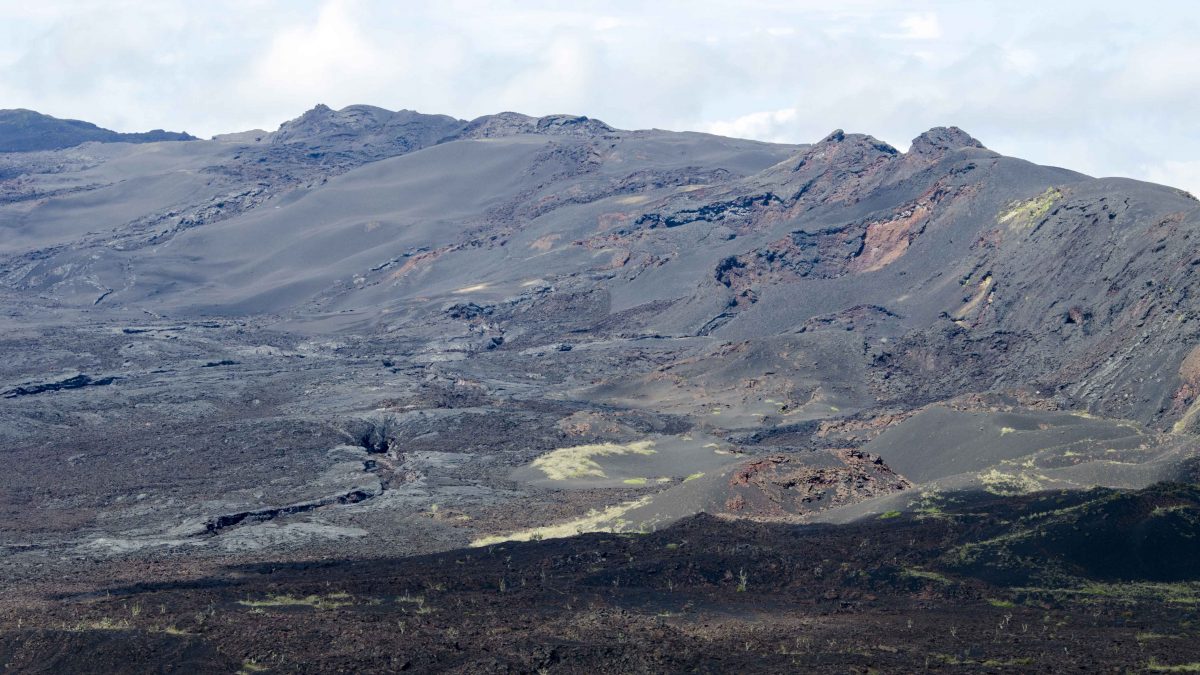 The Latest Eruption shows dark black lava from 2005 and reddish lava from the 1970s.